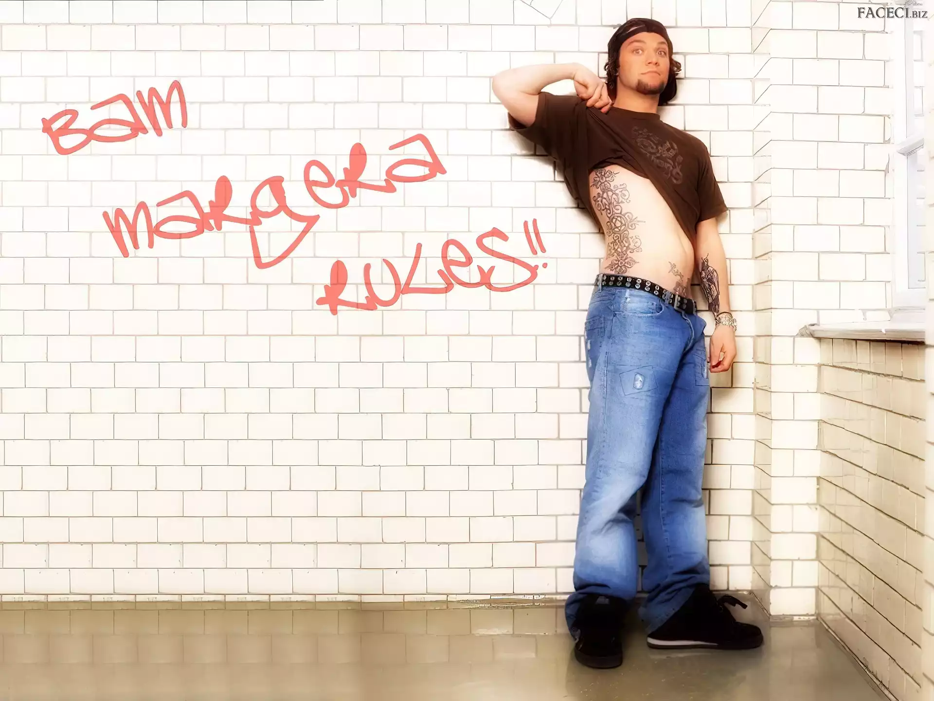 zegarek, Bam Margera, deskorolka włosy, Bam Margera, ciemne kurtka, Bam Margera, rozpięta okulary, Bam Margera, butelka okulary, Bam Margera, twarze t-shirt, Bam Margera, brązowy